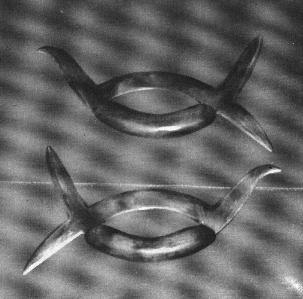 Most Deerhorn Knives seen in modern times have four points. This adds to the ability to trap the opponents weapon and disarm them. The fourth point was made recurve in recent history by our Grandmaster, Liu Yun Qiao. This allows for greater movement while avoiding cutting one's own arm. Grandmaster Liu in describing bagua weapons said that they are curved like bagua itself. Two deer-horn knives form the symbol of the Wu Tang organization. The eight points represent the Ba ji style, inside the circle are yin and yang representing Tai Chi, and together they symbolize Ba gua.