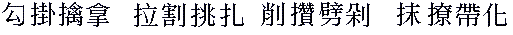 In action, the Deerhorn Knives have many techniques. As their shape is suggestive of the Yin Yang ball, so is their usage. While one is blocking, the other is attacking. While one traps, the other cuts. With blades in all directions, they are like the "claws of a dragon". There is a sixteen keyword formula for the various techniques of the Deerhorn Knives. These include hooking, locking, cutting, pulling and chopping to name just a few. The full sixteen character formula can be seen at the bottom of this page.